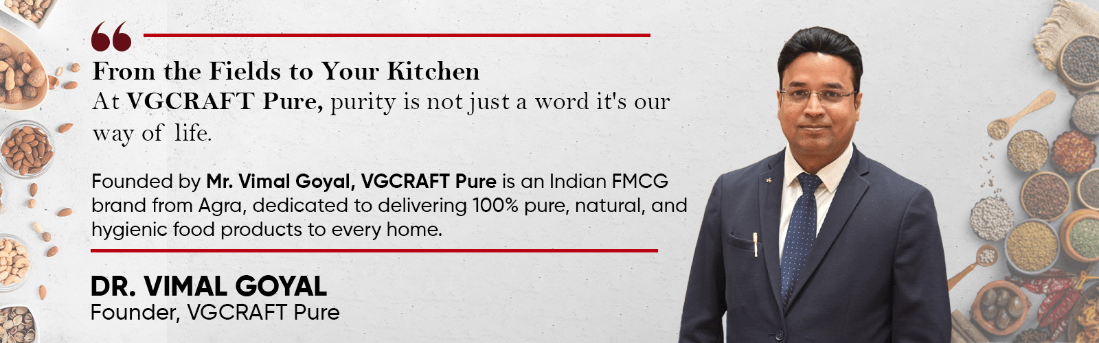At VGCRAFT Pure, purity isn’t just a promise — it’s a way of life. Founded by Dr. Vimal Goyal in Agra, VGCRAFT Pure is an emerging Indian FMCG brand dedicated to delivering 100% pure, natural, and hygienic food products directly from the fields to your kitchen.